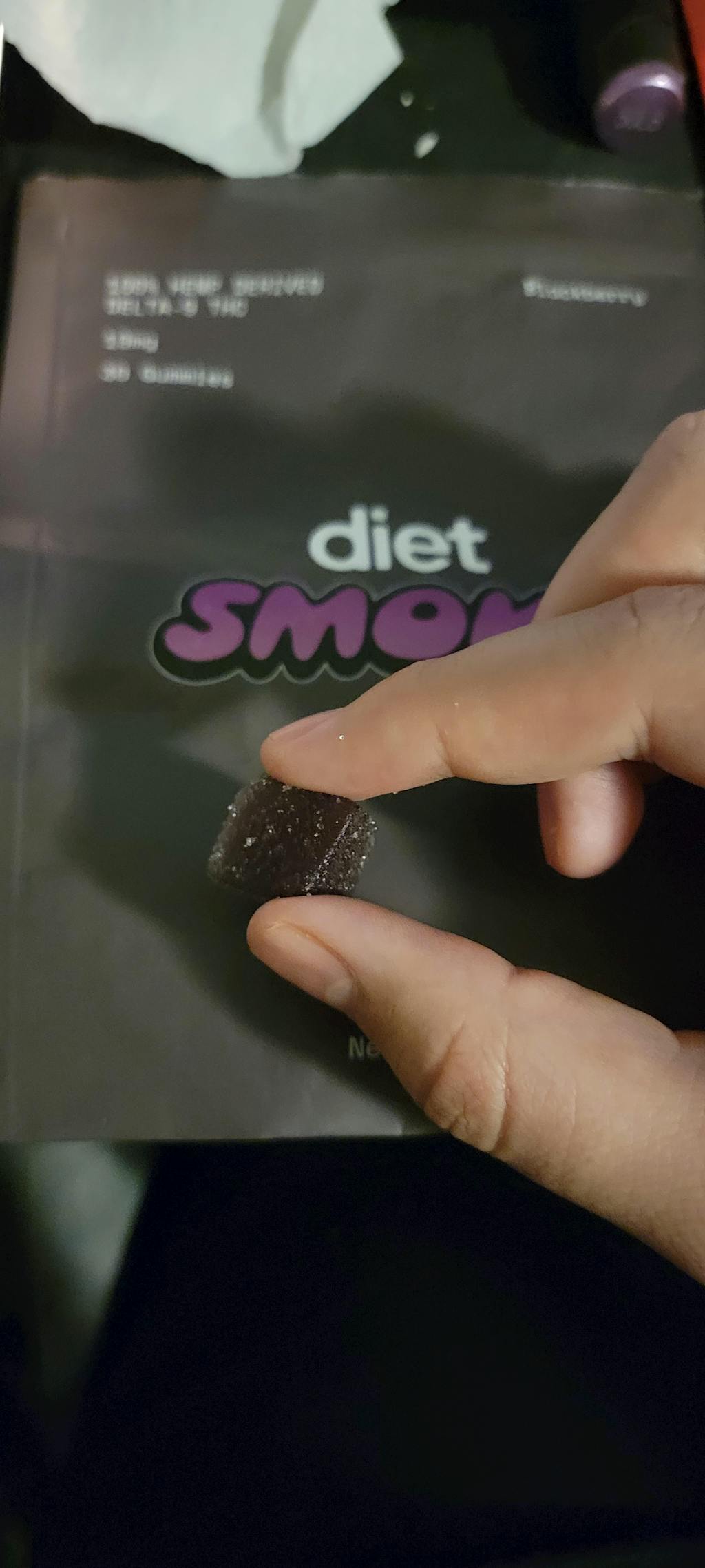Diet Smoke gummies package with two gummies beside it.